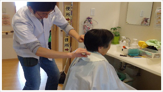 小矢部市にある「ヘアーサロンノーブル」の名井さんは、2ヶ月に一度らぶあけぼのの利用者さんの髪をカット、顔剃りに来てくださいます。